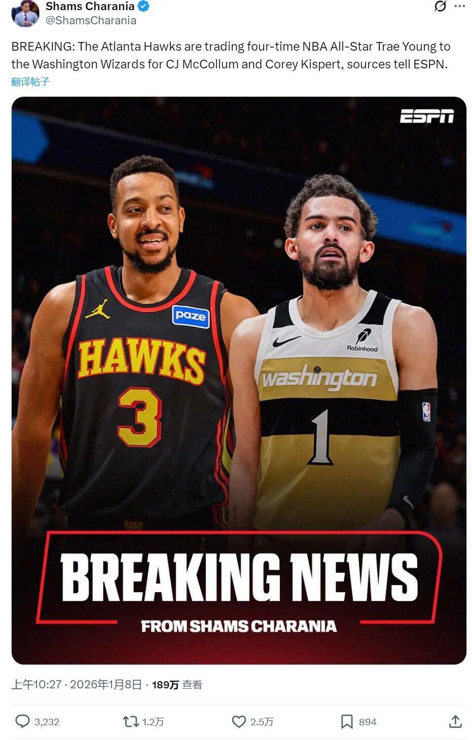 谁能想到,前天还在老鹰管理层办公室里主动摊牌的特雷杨,转眼之间就换球衣了;更戏剧的是,在交易官宣一刻,他本人还坐在老鹰替补席上。
