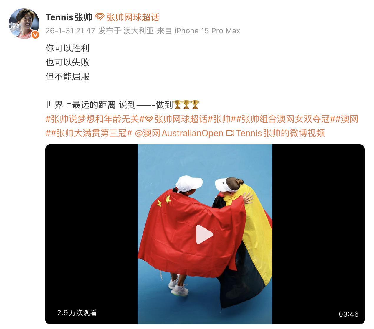 赛后采访中,张帅还向来到现场的中国网球运动员郑洁致敬。20年前的2006年,郑洁/晏紫在澳网女双决赛中逆转夺冠,实现了中国网球大满贯冠军“零的突破”。