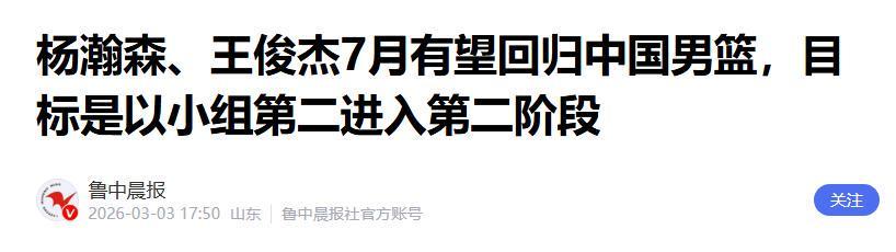 或将在7月份回归中国男篮,为下一阶段的世预赛增添了不少的期待。